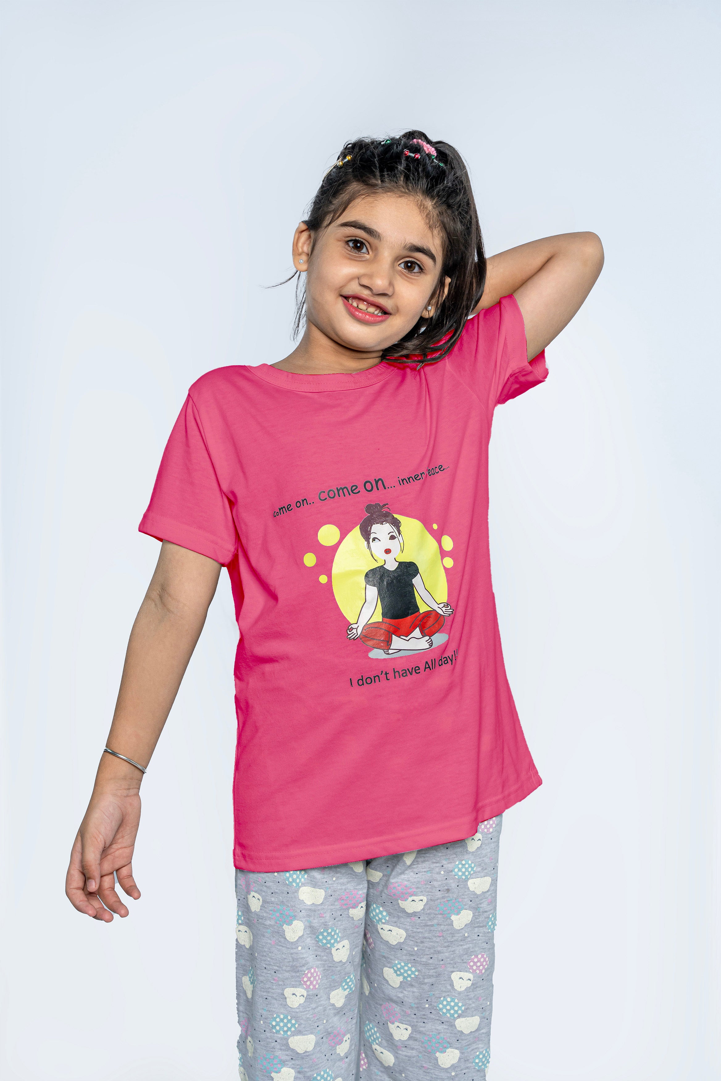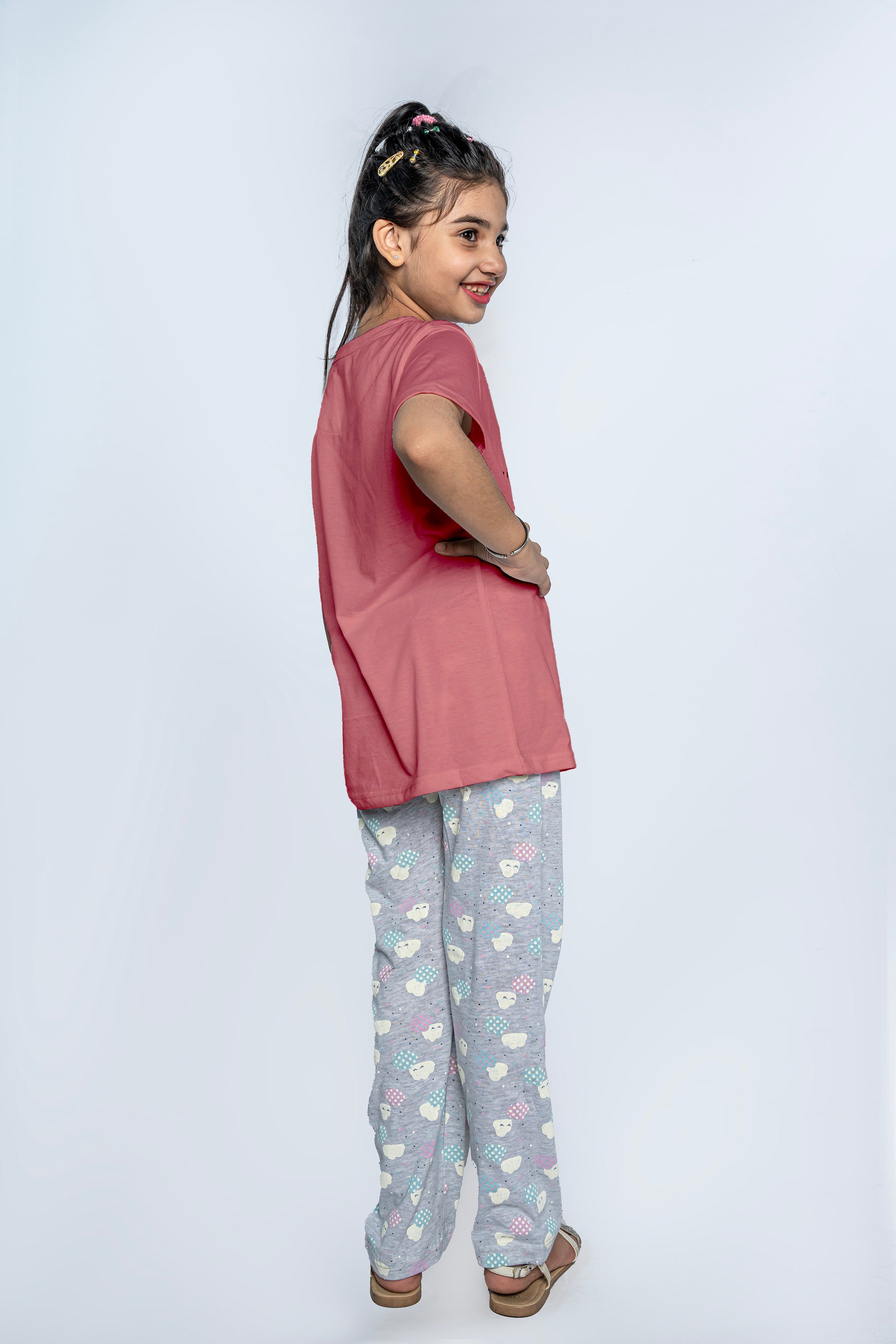 GIRL'S PAJAMA SET | SLEEPWEAR | PINK AND PRINTED GRAY TROUSER NIGHT SUIT -