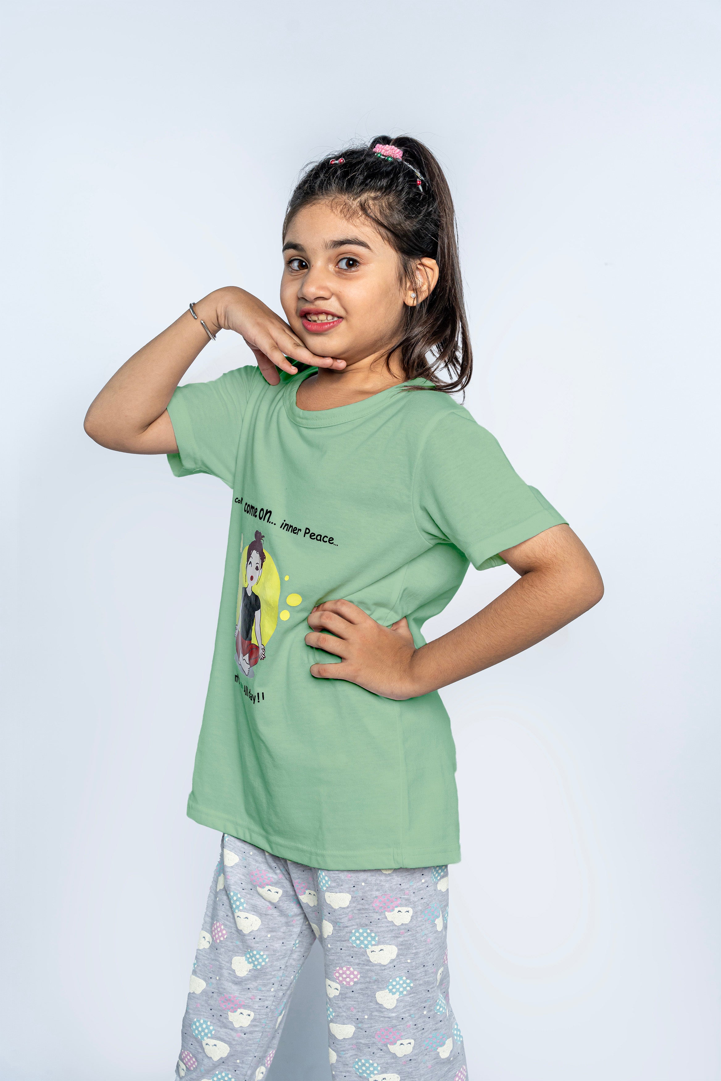 GIRL'S PAJAMA SET | SLEEPWEAR | LIME GREEN AND PRINTED GRAY TROUSER NIGHT SUIT -