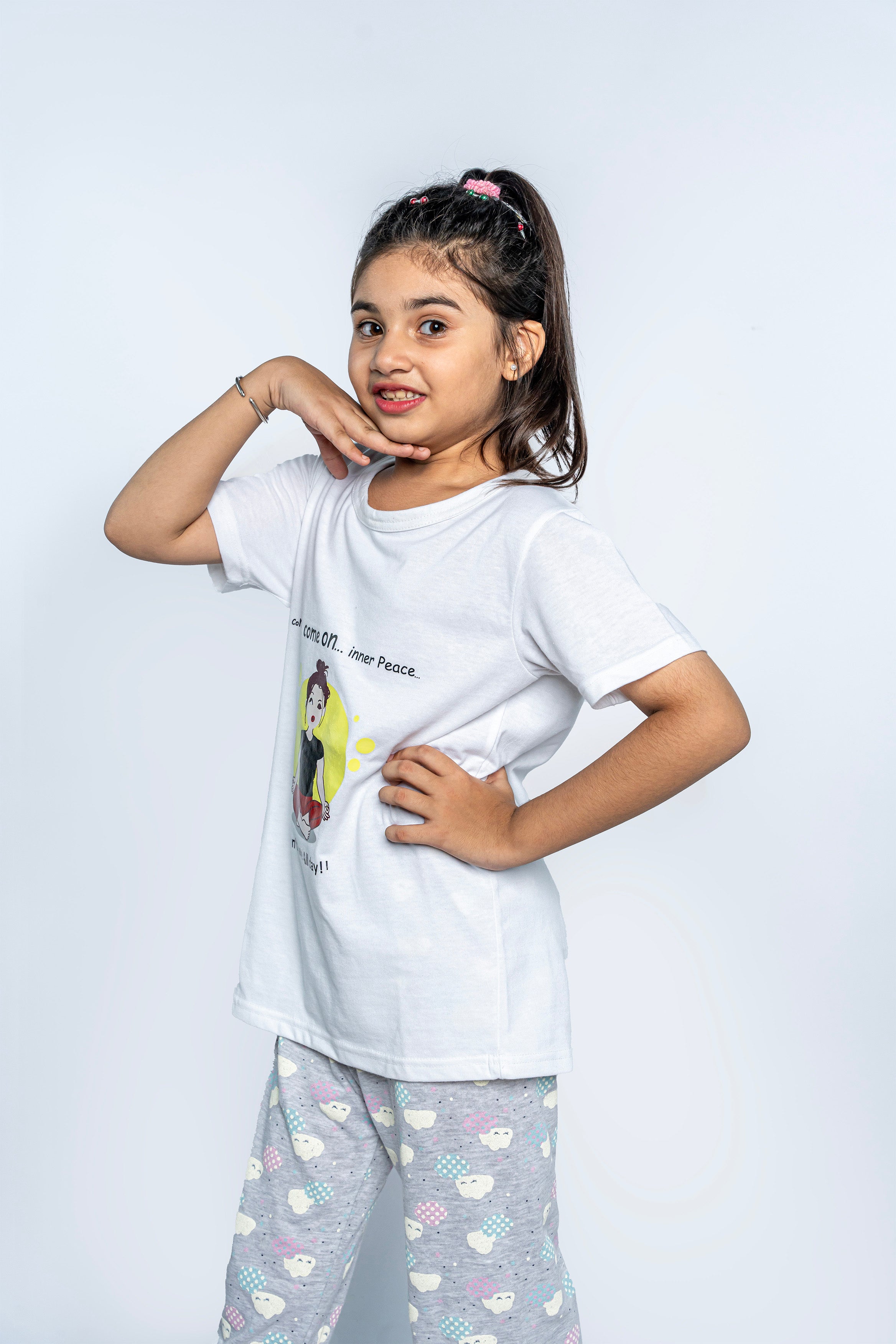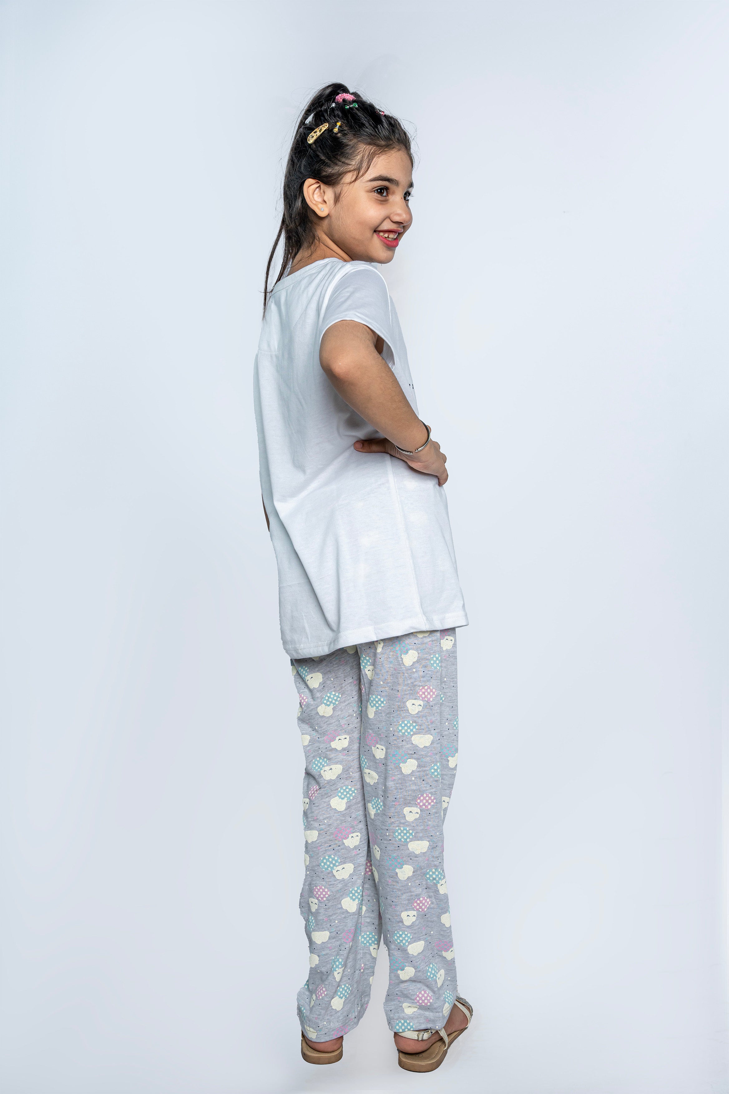 GIRL'S PAJAMA SET | SLEEPWEAR | OFF WHITE AND PRINTED GRAY TROUSER NIGHT SUIT