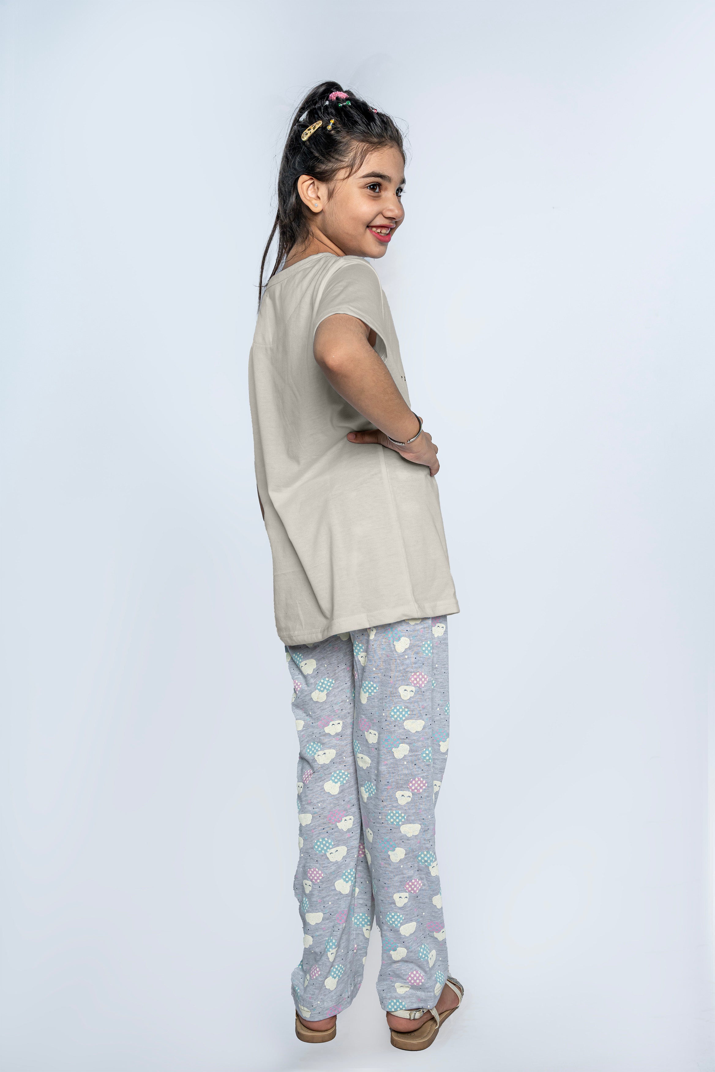 GIRL'S PAJAMA SET | SLEEPWEAR | IVORY AND PRINTED GRAY TROUSER NIGHT SUIT -