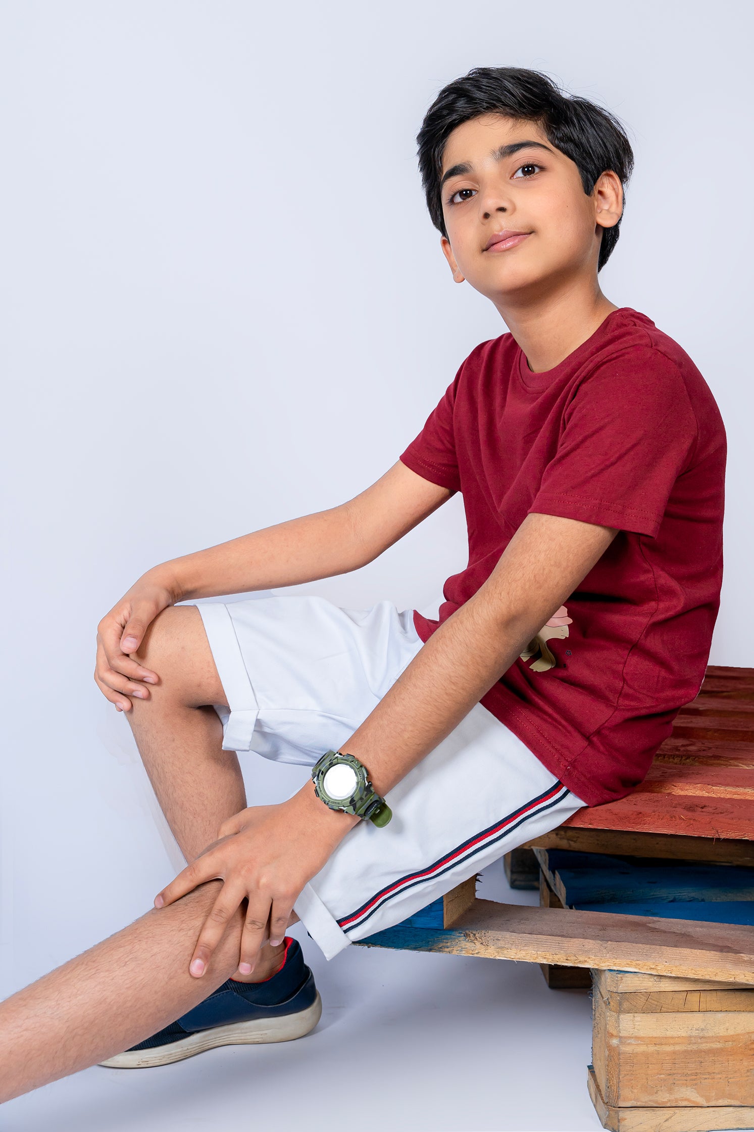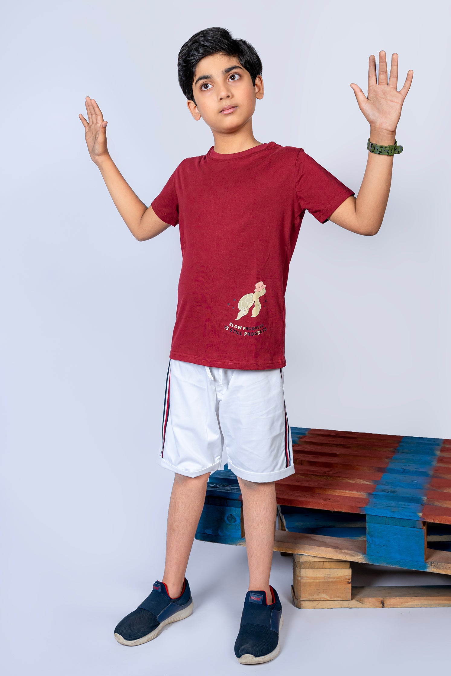 BOY'S T-SHIRT MAROON WITH FRONT "NO ROAD NO CAR" PRINTING -
