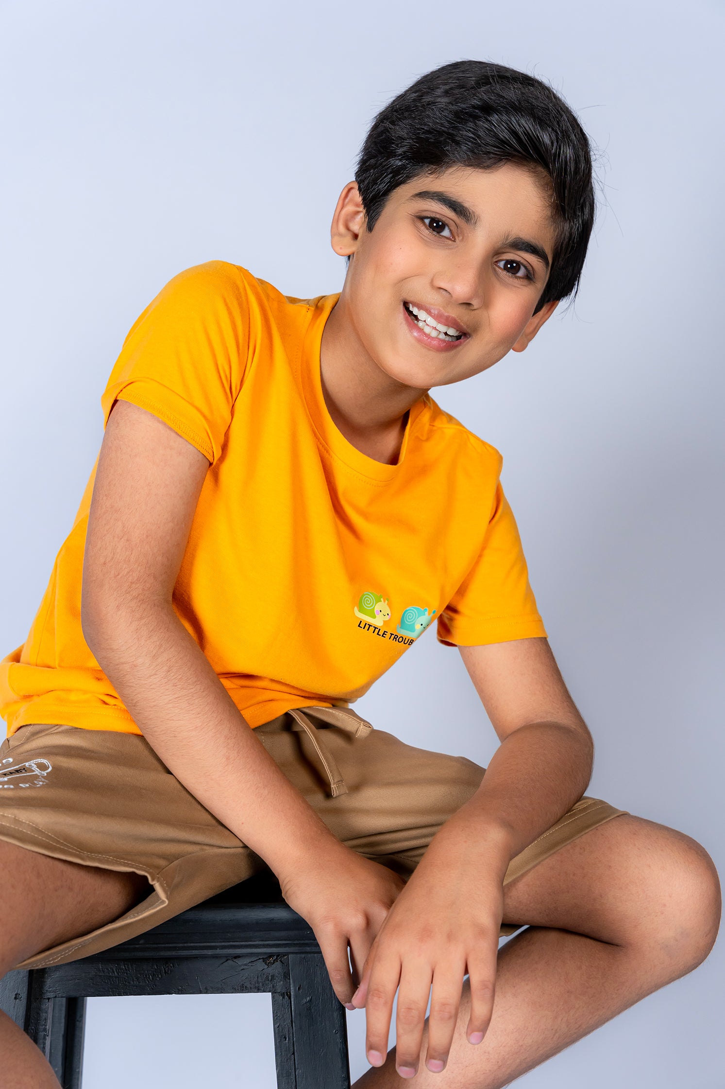 BOY'S T-SHIRT MUSTARD WITH "LITTLE TROUBLE" PRINTING -